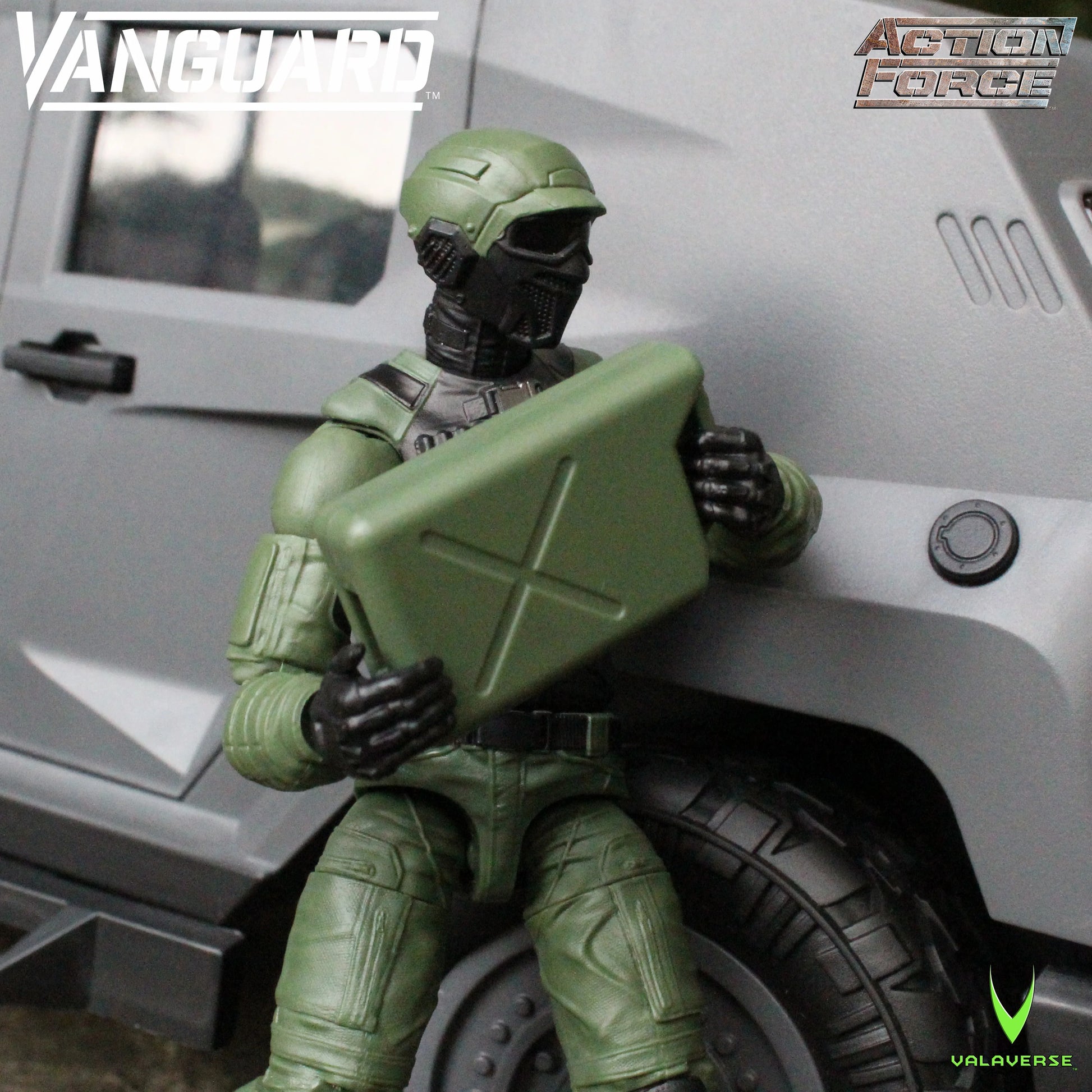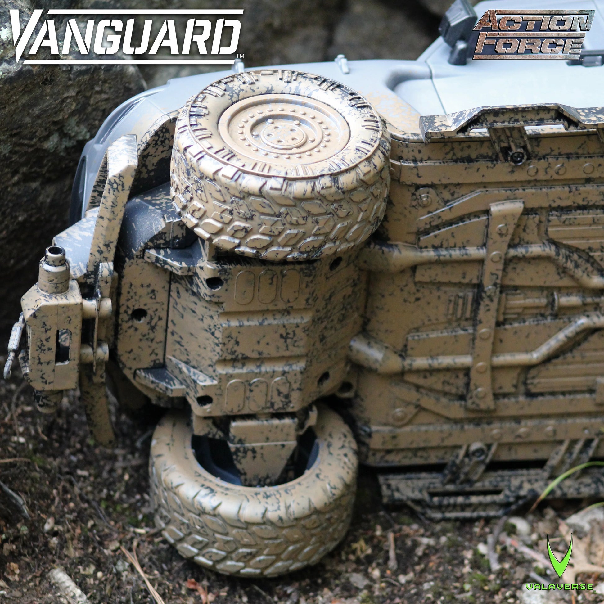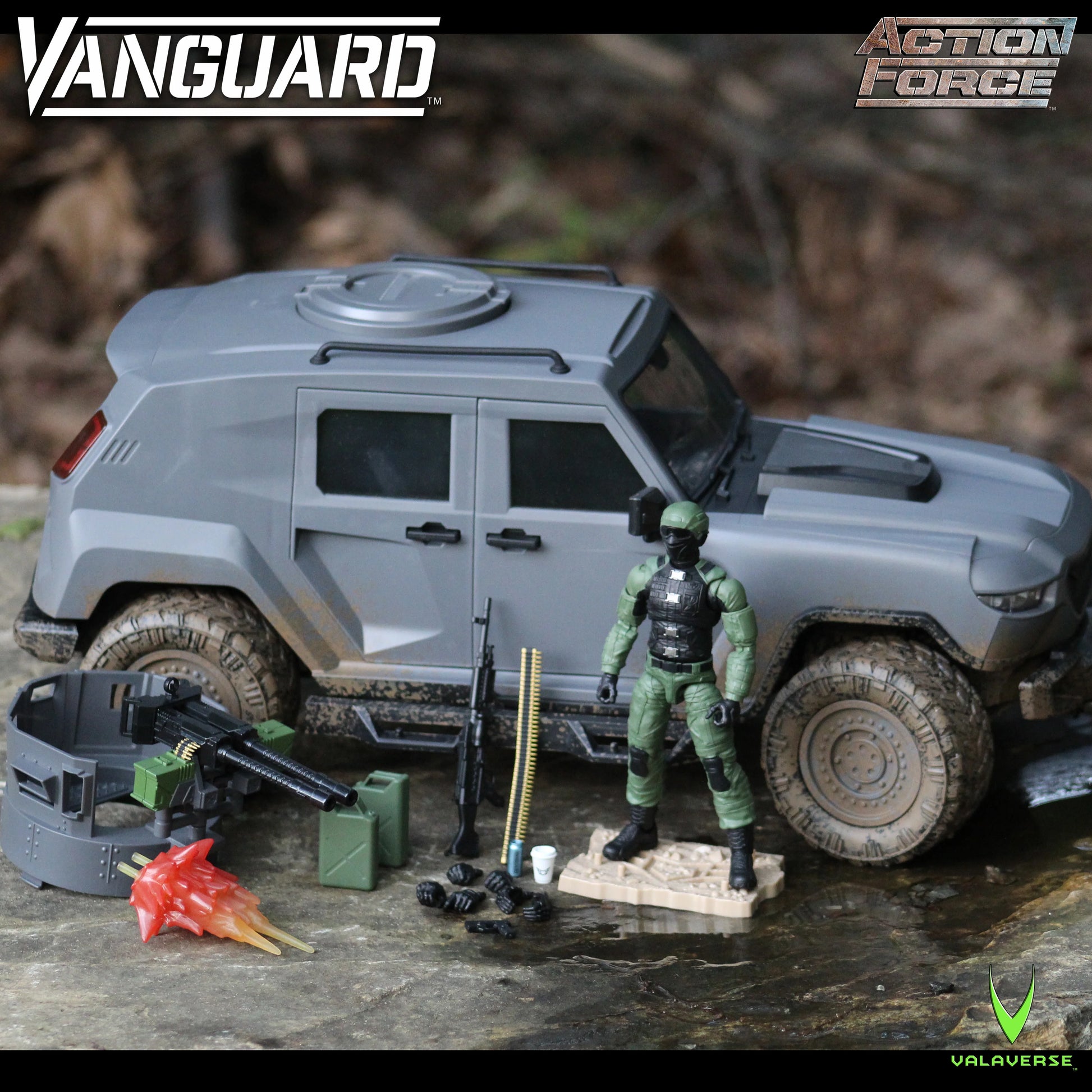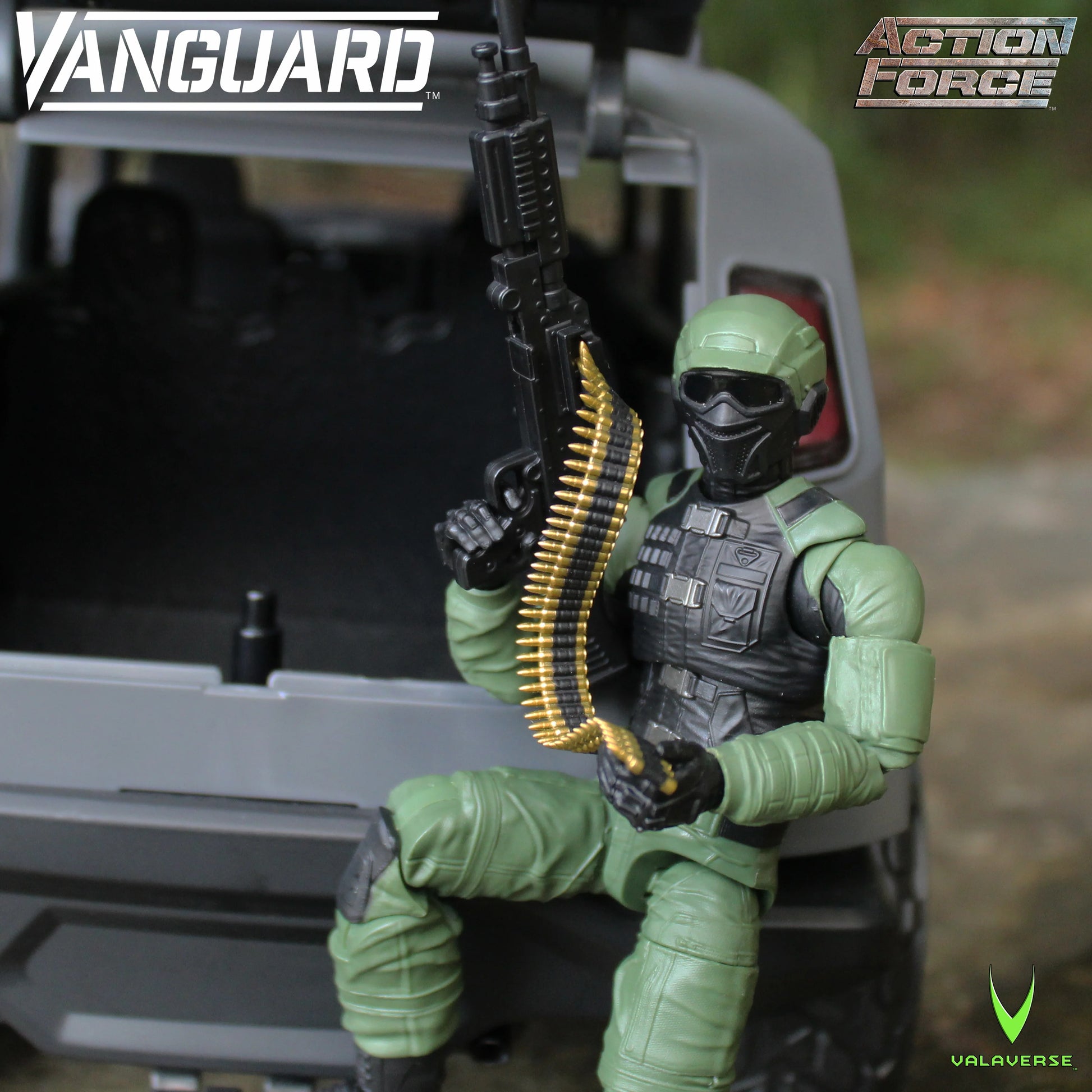 Valaverse is excited to introduce the Vanguard 1/12 scale vehicle! This vehicle features a 6-inch Reaper figure, as well as removable doors, turning front tires, a working front winch, removable gas cans that fit into the trunk, a top hatch that can be removed to install the included machine gun turret, and a removable shovel accessory.