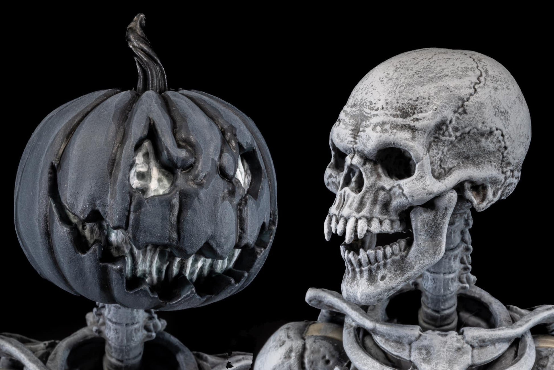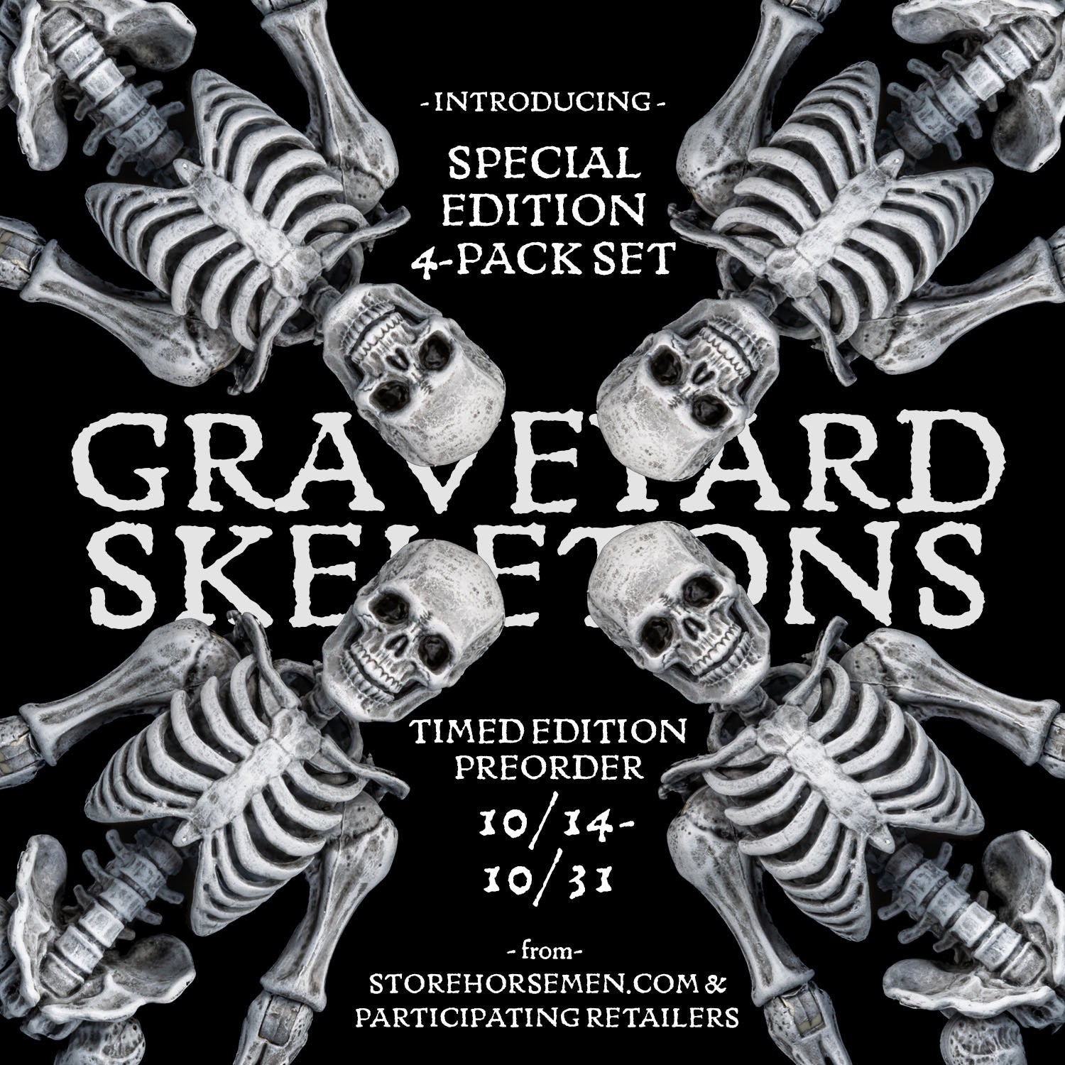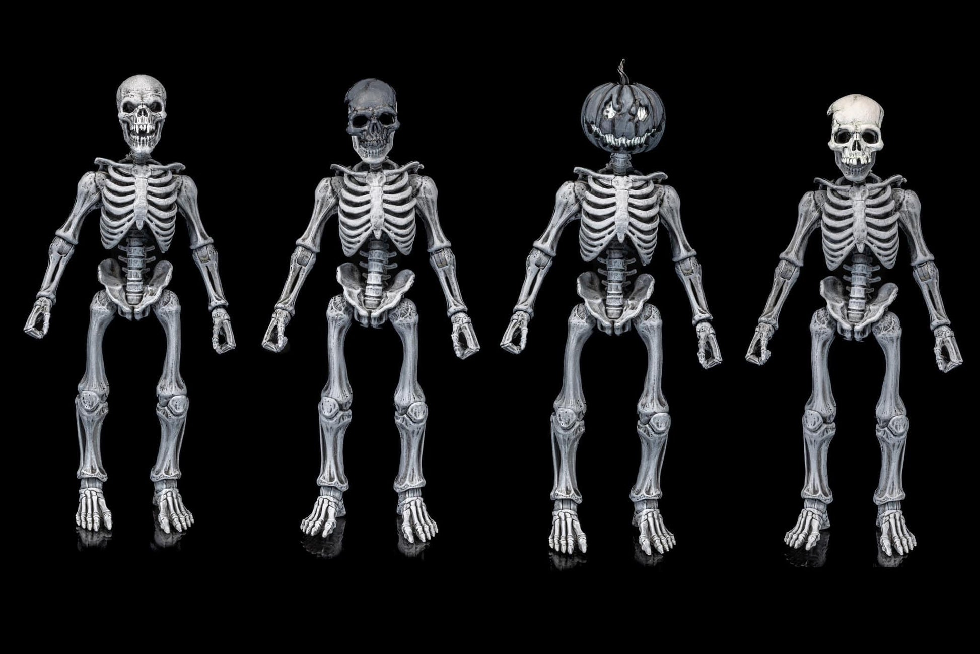 This set includes 4 of the standard skeleton heads plus repainted versions of the pumpkin first offered in the Figura Obscura Headless Horsemen set and a vampire skull like the one found in the ALL STARS 6 heads pack. In addition to these repainted pieces, this set also features some brand - new skeleton "masks" that are debuting in this release. These bone masks fit right on top of the skeleton's heads.