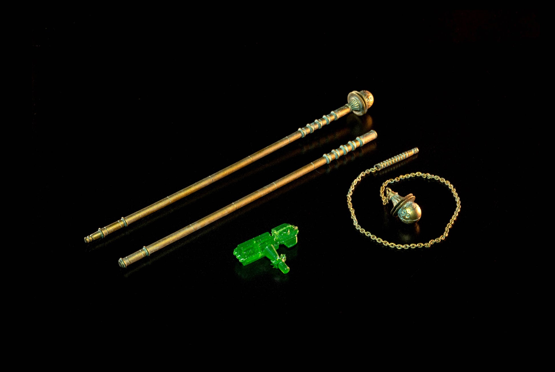 - Accessories: Staff, broken down staff - which includes the shaft of the weapon and a Meteor Hammer with chain, holographic attachment, and extra hands (hands are not pictured in accessory shot)