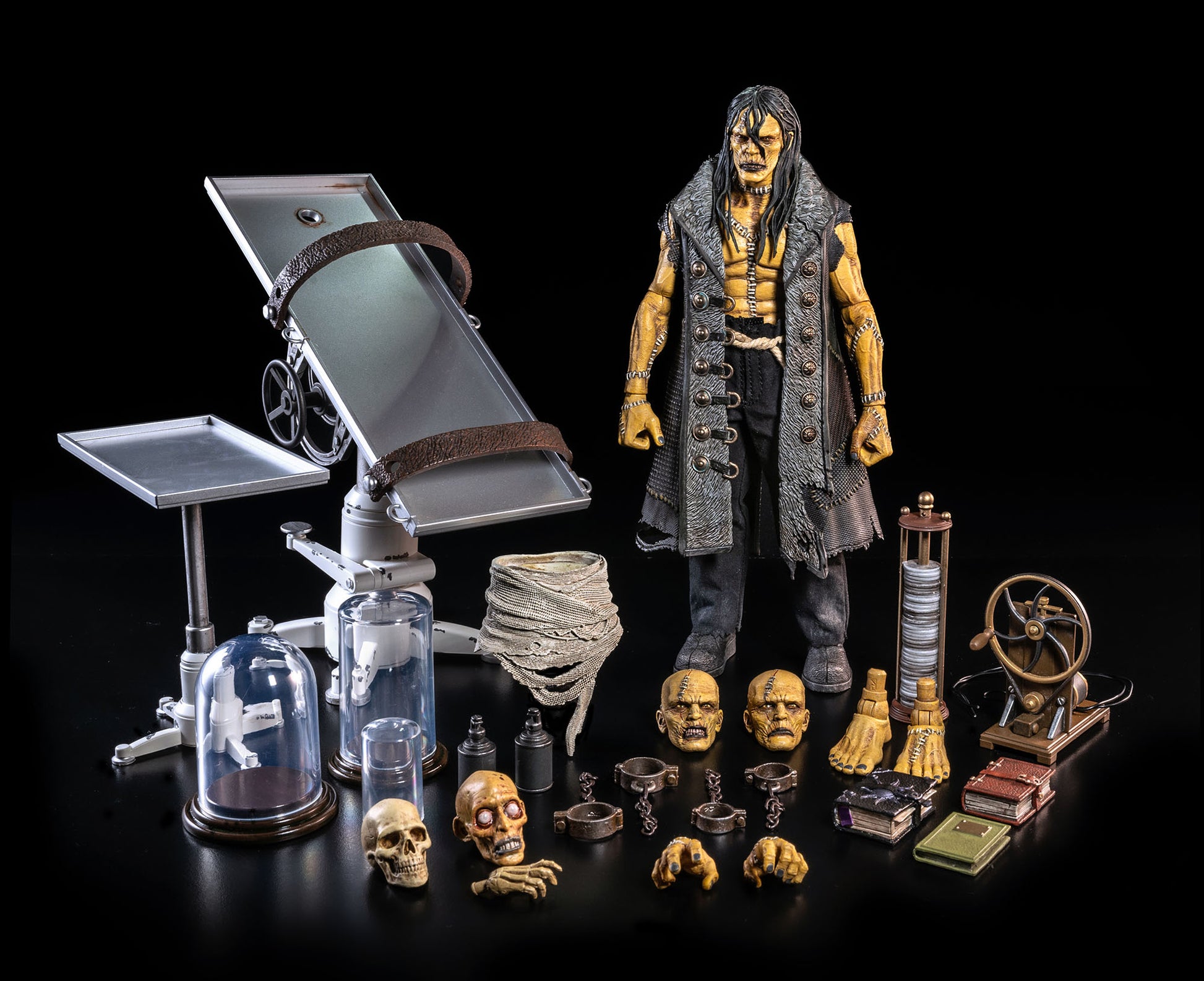 In addition to aforementioned pieces allowing you to create different looks for the figure itself (including a few extra heads), this Figura Obscura release also continued the recent trend of including “diorama-style” display pieces inside the package. In fact, the “Frankenstein’s Creature” set includes more diorama items than any release we have done to date – including a large operating table with restraints, a side table, various specimen jars – complete with removable specimens inside, books, and other devices that Dr. Victor Frankenstein would have used in the experiments he conducted to bring his Creature to life! You can see the extensive pack out of items this figure includes in the image below.