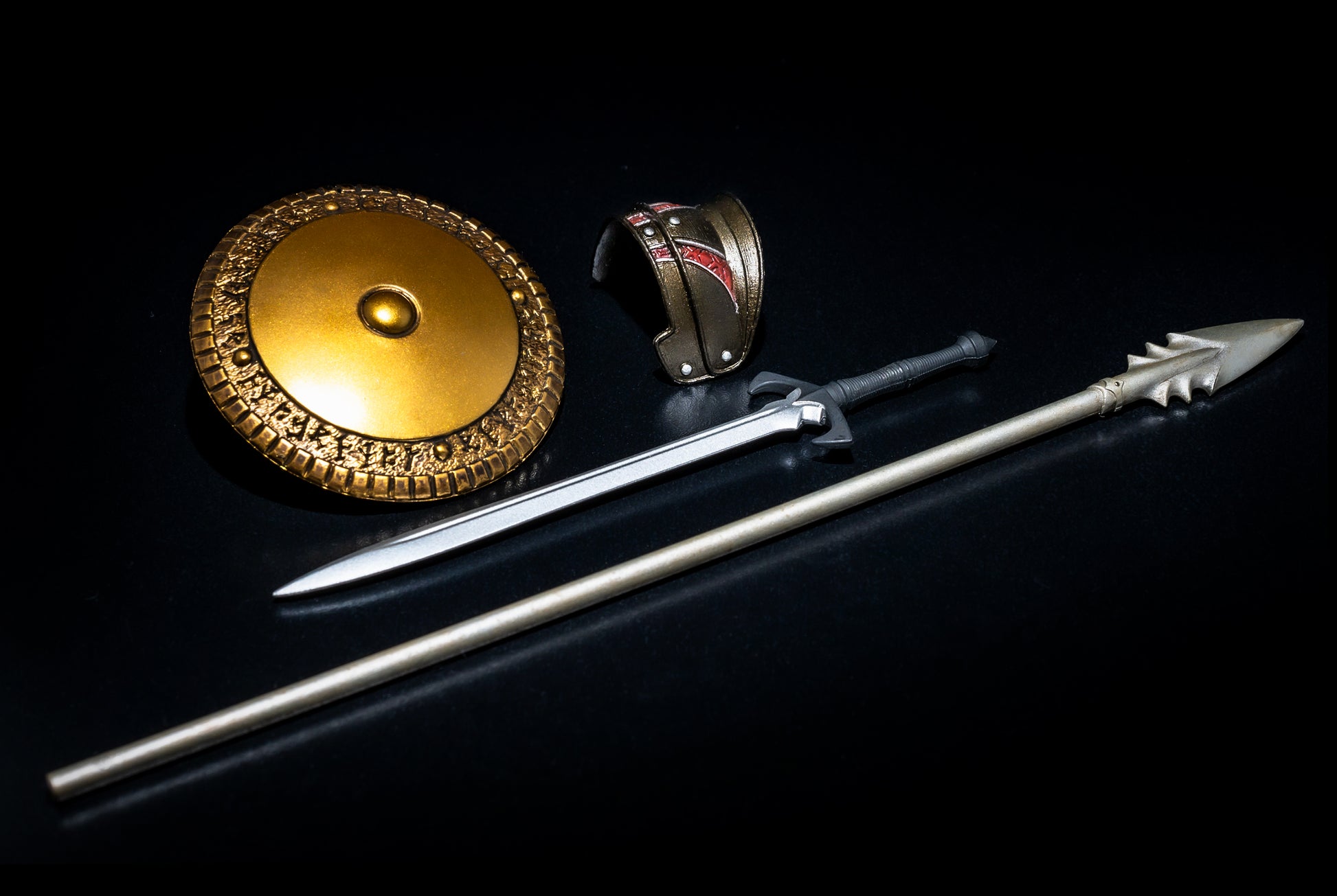 - Accessories: Round shield with handle, spear, long sword