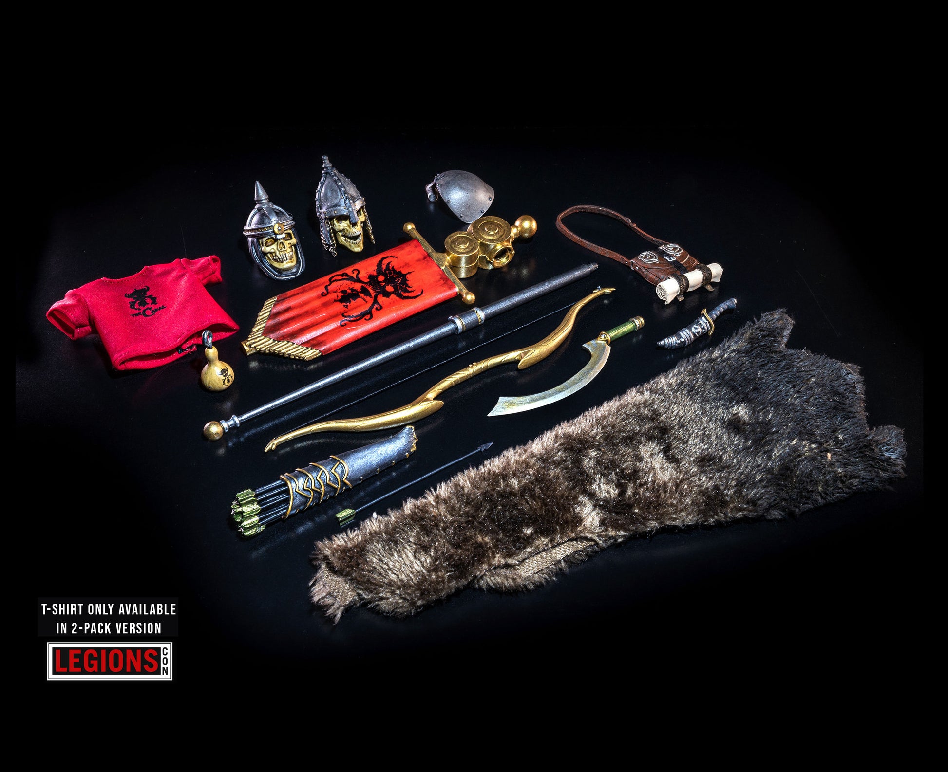 - Accessories: Cabal logo banner and pole, drinking gourd with Cabal logo, kopesh sword, long bow, arrow, quiver. dagger and sheath, hip bag, fur cloak - plus a red Cabal t-shirt that was only part of the LEGIONS CON show edition