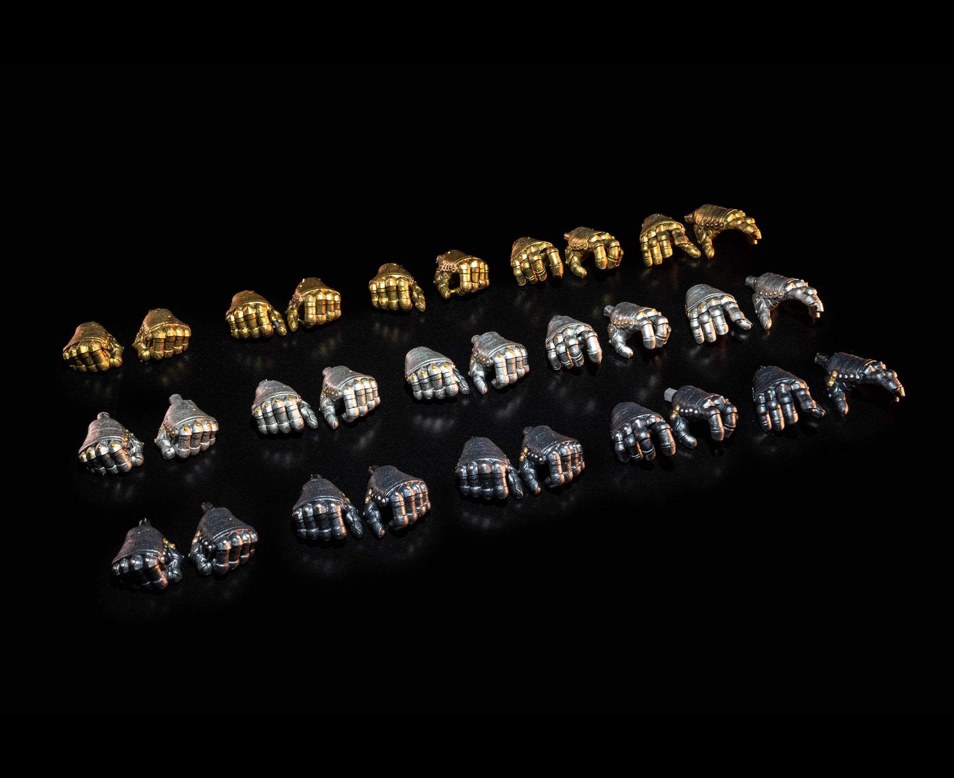 This set includes 15 sets of 1.0 style hands, 5 each painted to match Sir Gideon Heavensbrand 2, Sir Adalric, and Sir Elijah. They also work with any other 1.0 knight or figure.