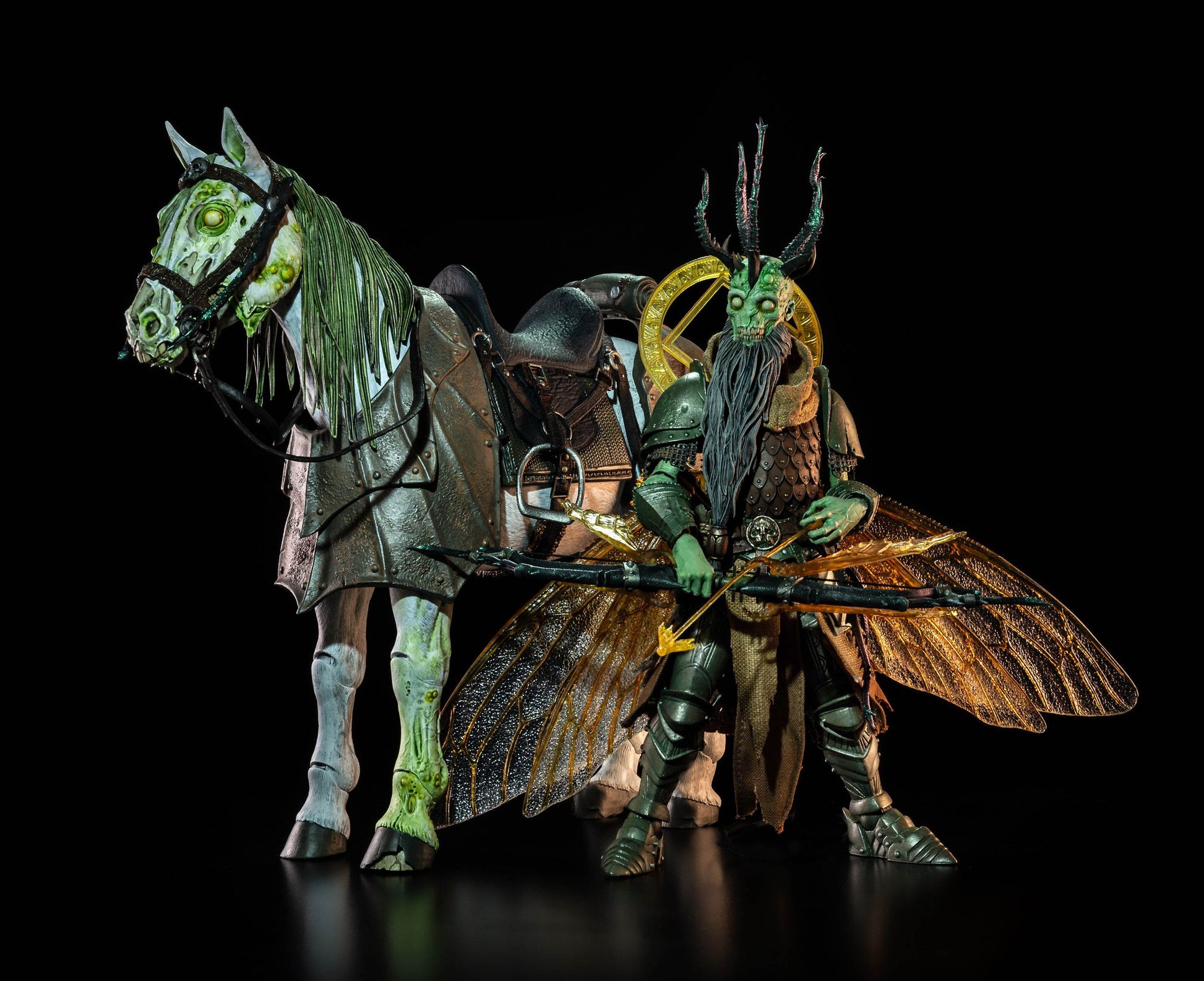 A terrifying visage of sickness and decay, the spiteful god Poxxus is pestilence incarnate. Dripping with disease and crackling with menace, the horrific sight of Poxxus alone is enough to inspire dread. Armed once again with his deadly bow, The Plaguesayer, Poxxus can fire off hordes of infectious insects with every pull of his string. Triumphantly riding atop his rotting horse, Phlogeus, Poxxus travels the roads of Mythoss with the intention of poisoning the Realm and all those that live within.