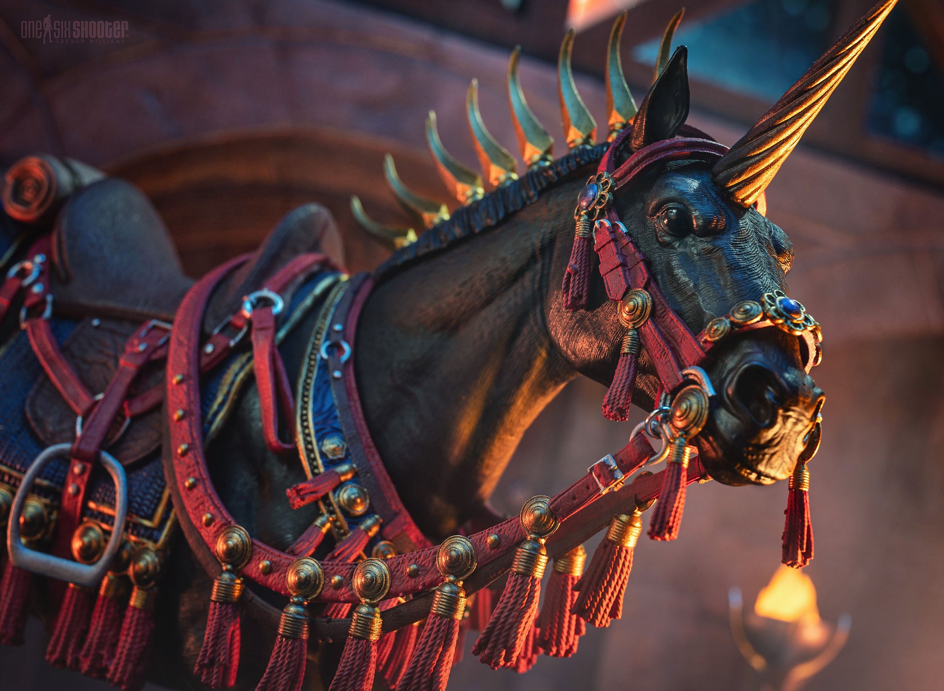 Never known for his modesty, Skapular the Cryptbreaker enjoys beauty and opulence in all things. There were those within the Sons of the Red Star who thought he had gone mad when he nearly emptied his coffers to acquire a steed he deemed worthy of his station. Those whispers were immediately silenced the first time the undead assassin rode forth on his dark unicorn, Uumbra. A powerfully magical creature whose existence was thought to be little more than a fairytale from the earliest days of the Realm, Skapular enjoys bragging about how he paid a kingly fortune in order to secure the unicorn from “beyond the shores of Mythoss.” More than just a showpiece, Uumbra’s magic has helped Skapular execute some of his most daring capers, and escape from some of his closet calls, in his time as leader of the Sons of the Red Star.