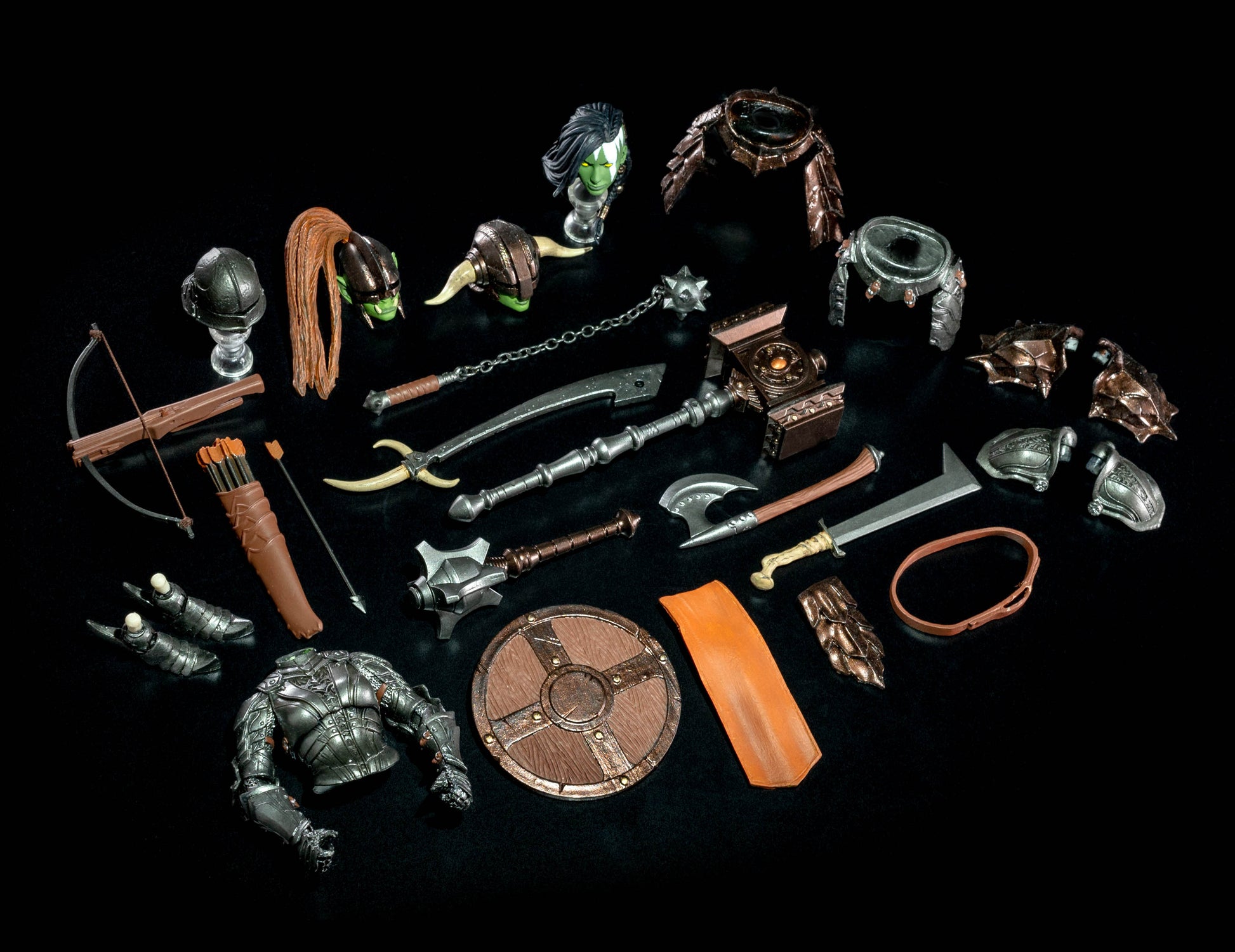 - Accessories: Orc sword, crossbow, quiver, arrow, bone-handled sword, dwarf mace, flail, skull-topped axe (no skull), wooden shield, warhammer, 2 sets of pauldrons, 2 faulds armor, 2 loin pieces, 2 sets of feet and ankles, 2 torsos, 2 sets of arms