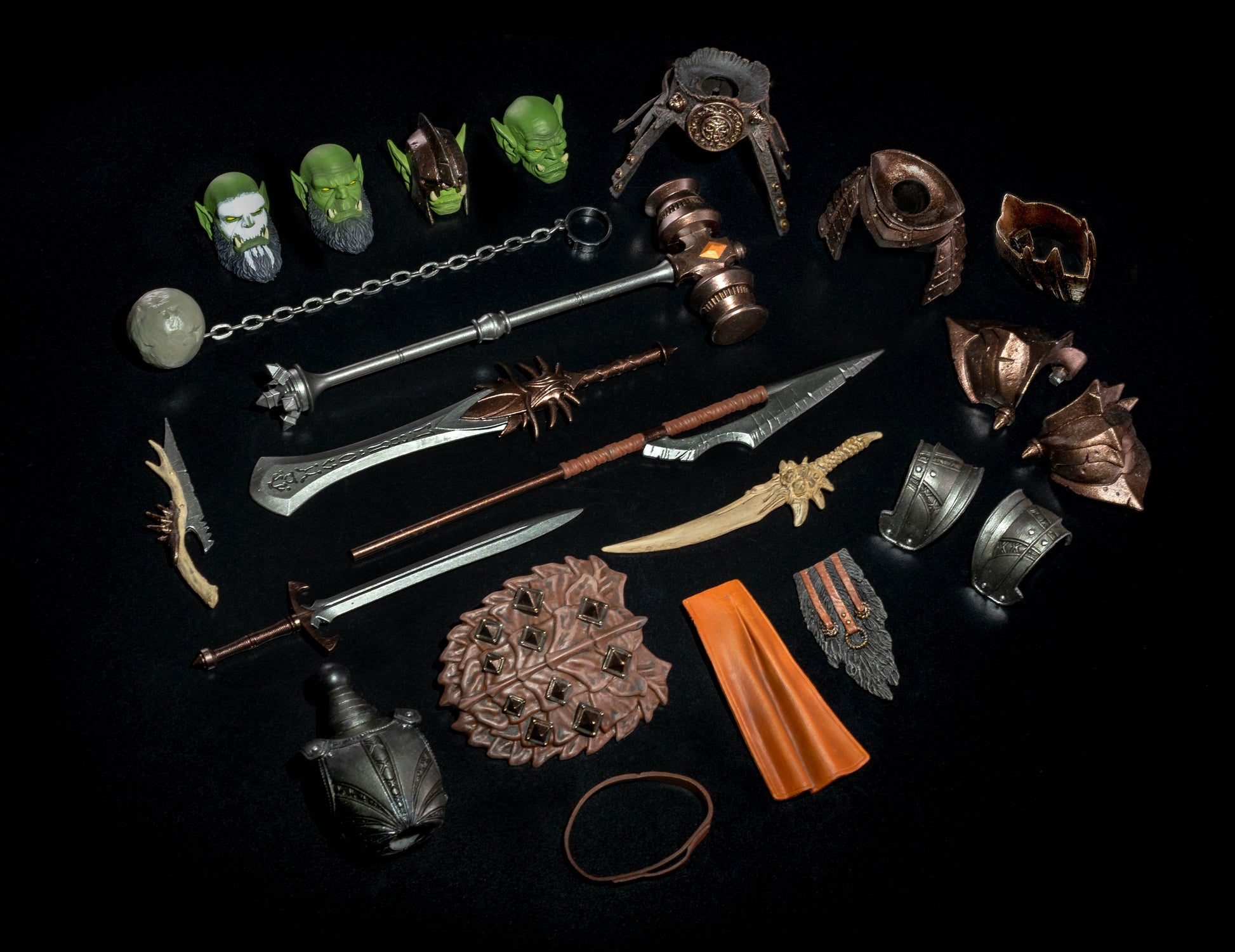 Accessories: Ball and chain, bone knife, bone-handled knife, buster sword, dwarf hammer, dark spear, long sword, turtle shell shield, 2 set of pauldron armor, 2 faulds armor pieces, 2 loin pieces, neck armor, plus 2 torsos